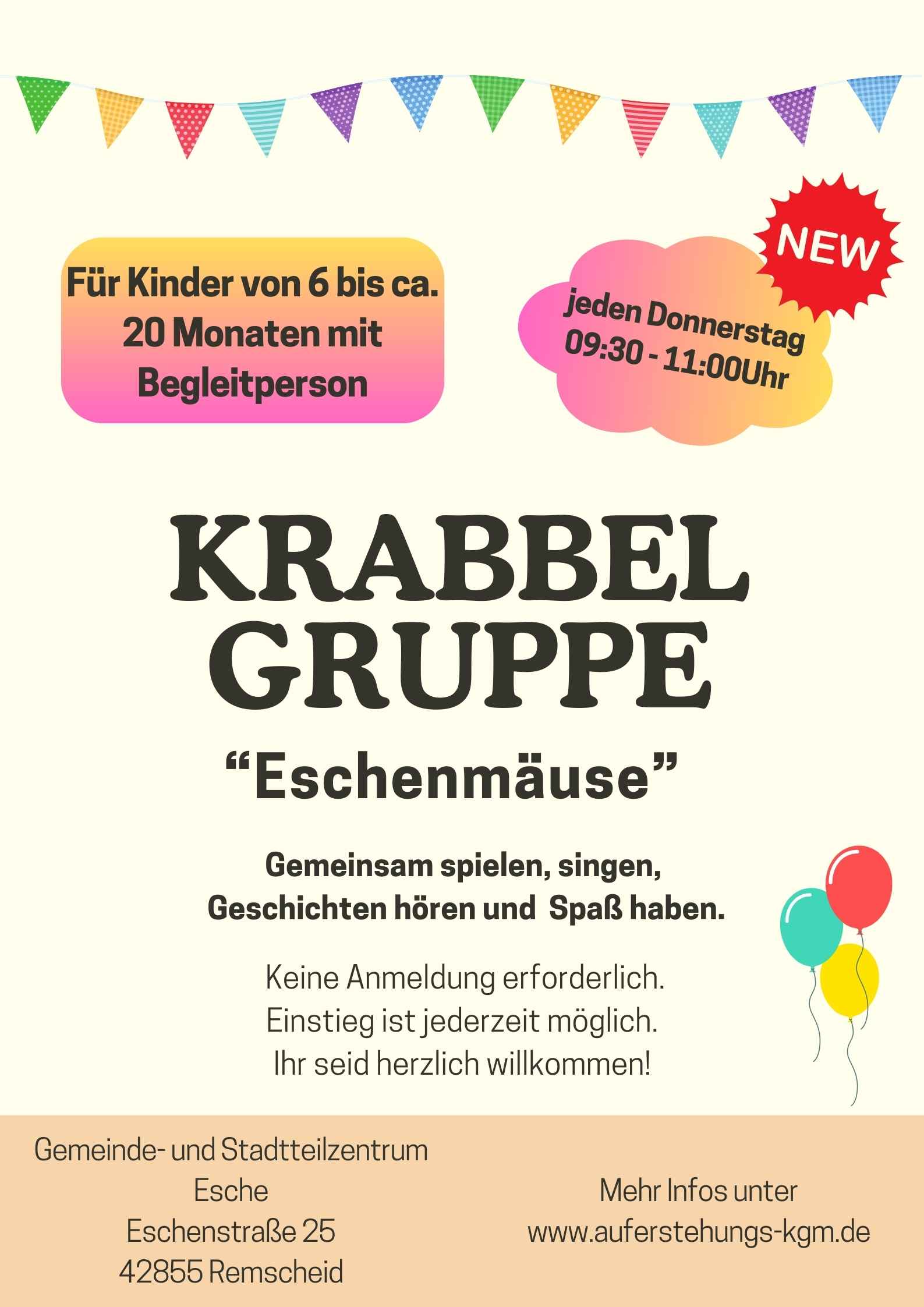 Ab September ist die neue Krabbelgruppe für Kinder von 6 Monaten bis ca. 20 Monaten mit Mama, Papa, Oma, Opa oder einer anderen Bezugsperson gestartet. Unter dem Namen „Eschenmäuse“ bietet die Gruppe die Möglichkeit, in einer liebevollen und unterstützenden Umgebung zusammenzukommen und sich auszutauschen. Bei uns stehen das gemeinsame Singen, Spielen und Kennenlernen im Vordergrund. Besondere Highlights, wie Bastelangebote, kindgerechte Bibelgeschichten und Gebete dürfen auch nicht fehlen.